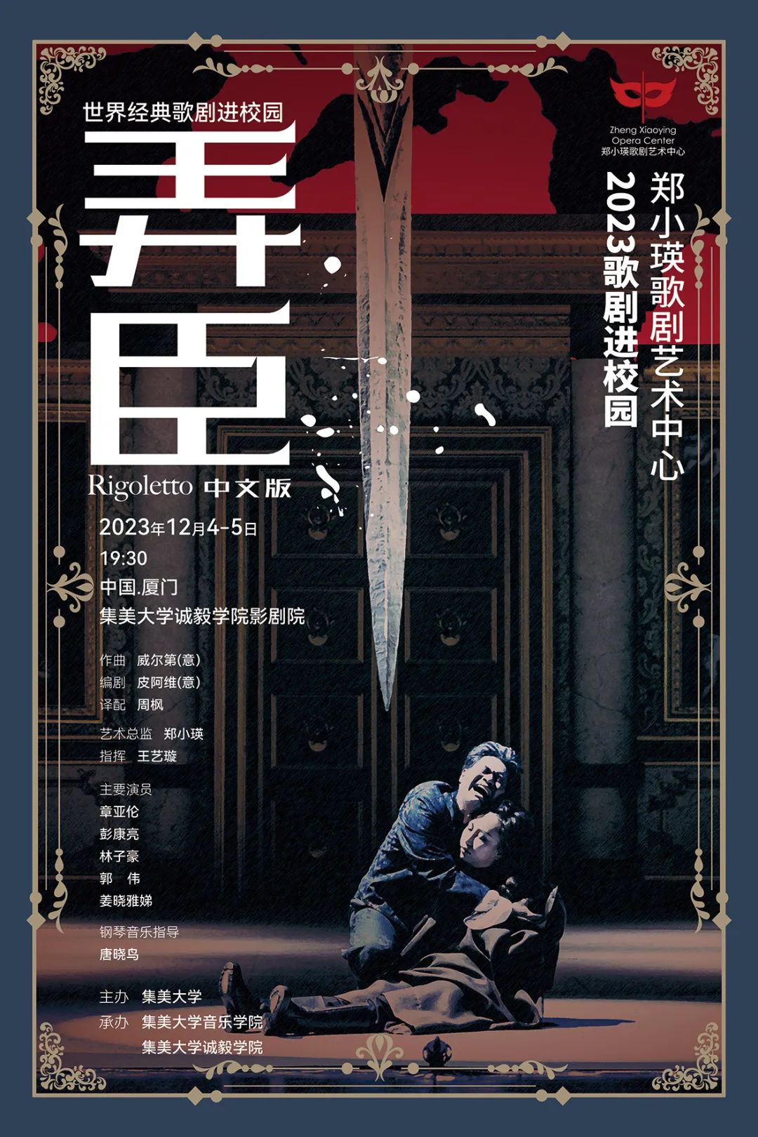 本场演出由郑小瑛教授担任艺术总监,王艺璇担任指挥,唐晓鸟担任钢琴音乐指导,邀请老中青声乐艺术家章亚伦、彭康亮、林子豪、郭伟、姜晓雅娣领衔主演,还有集美大学音乐学院声乐教研室两位优秀青年教师卢骥、刘胤隆共同参演,展现集美大学的艺术风采,共同为学子们献上世界经典歌剧《弄臣》中文版。
