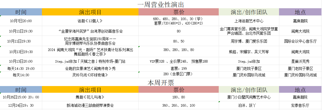 一、 一周演出预告及演出开票总览