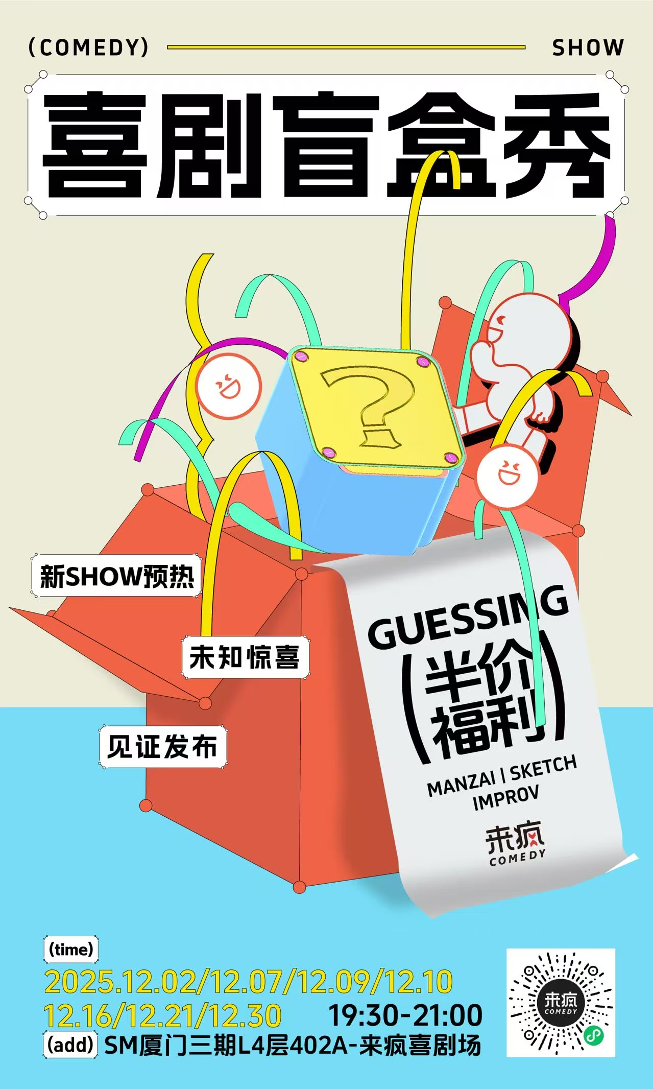 新SHOW预热,未知惊喜,见证发布。在盲盒秀中你有可能解锁单口喜剧、即兴喜剧、亲子喜剧、素描喜剧和漫才喜剧等形式。不仅能收获喜剧的快乐,还能体会到盲盒的刺激惊喜。