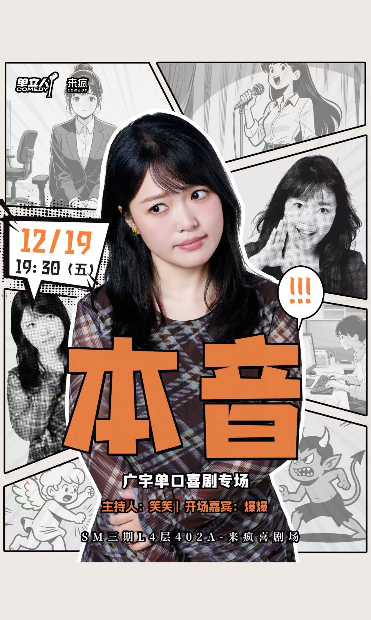 外企“佟湘玉”+90 后北漂女青年面对工作、社交、被催婚等等现实问题。在这个专场里【广宇】把成年人的伪装撕碎了当炸弹往台上扔 。她说:“这个社会说话越来越难了,没有人能做到绝对客观,但我想通过这个专场说出自己的本音。”来现场和广宇一起听听我们内心原本的声音吧。