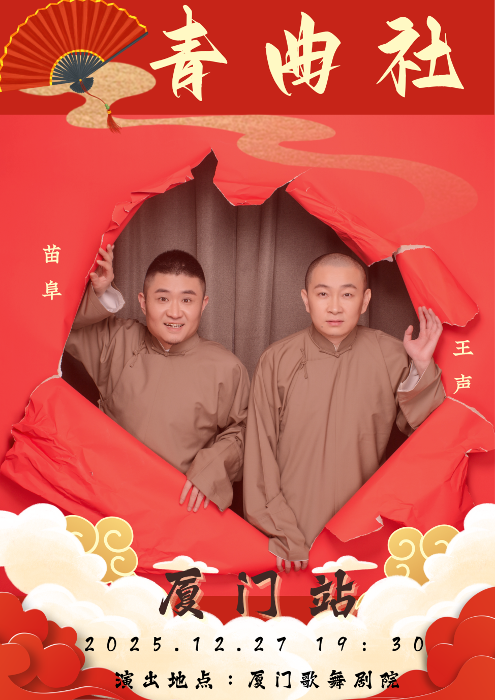 苗阜王声将携青曲社众青年演员在厦门歌舞剧院举行专场演出,他们将为观众奉上一场前所未有、笑出天际的盛宴,全新的段子、熟悉的场馆,再次在爆笑中相聚。